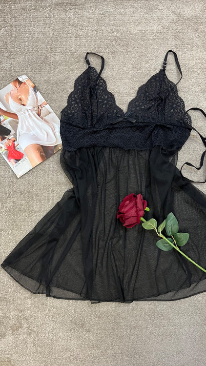 لباس خواب زنانه جلو باز از ترکیب حریر لطیف و گیپور ظریف با طراحی بسیار شیک و زنانه.مدل یقه گیپور با بند گردنی و برش آزاد که به زیبایی روی بدن مینشیند و استایل عروسکی و رمانتیک ایجاد میکند.قسمت پایین لباس از حریر نیمهشفاف با لبههای گیپور کار شده که جلوهای لوکس و خاص دارد.