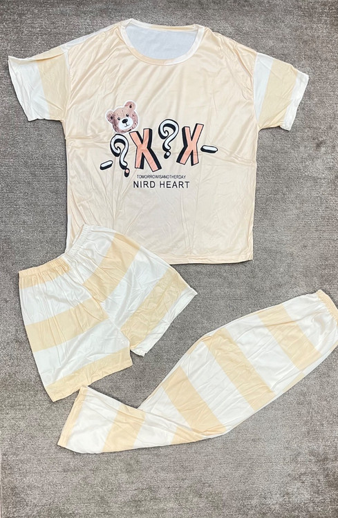ست راحتی سهتیکه زنانه شامل تیشرت، شورتک و شلوار، با طراحی فانتزی خرس و چاپ نوشته جذاب، مناسب استفاده روزمره و لباس خواب.جنس پارچه نرم، لطیف و خنک بوده و برای پوست حساس کاملاً مناسب است. شلوار و شورتک دارای کمر کشی راحت هستند و آزادی حرکت عالی ایجاد میکنند. ترکیب رنگ کرم و شیری با طرح راهراه، ظاهر شیک و دلنشینی به این ست داده و گزینهای عالی برای استایل خانگی و خواب راحت است.