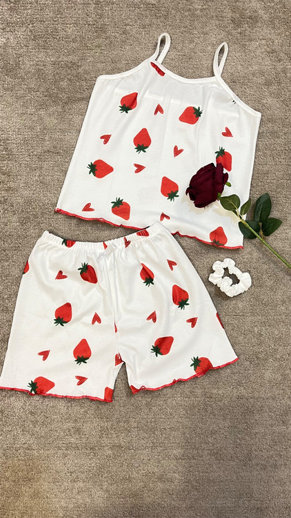 ست لباس خواب دوتیکه زنانه شامل تاپ بندی و شلوارک، با طرح توت فرنگی فانتزی قرمز و مشکی روی زمینه سفید، انتخابی جذاب و دخترانه برای خواب و استراحت در خانه.پارچه سبک و لطیف بوده و حس خنکی و راحتی فوقالعادهای روی پوست ایجاد میکند. شلوارک دارای کمر کشی نرم است و تاپ بندی با بند قابل تنظیم، فرم بدن را زیباتر نشان میدهد.این ست گزینهای عالی برای استایل خانگی، هدیه ولنتاین و عکسهای فانتزی است.